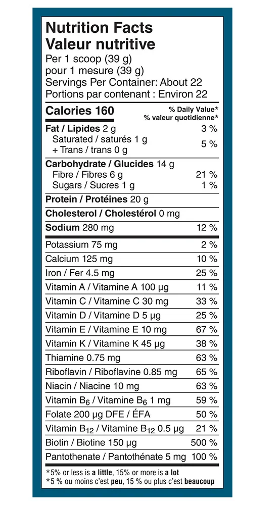 Protéines de pois, Gomme arabique, Amidon de pois, Poudre de brocoli biologique, Poudre de spiruline biologique, Mélange d’extraits de fruits et de légumes (épinard, brocoli, carotte, betterave, tomate, pomme, canneberge, orange, bleuet, fraise, champignon shiitake, cerise), Poudre de chou frisé biologique, Algue marine, Gomme de xanthane, Mélange de fruits (extrait de pépin de raisin, poudre de mangoustan, poudre de maqui biologique, poudre de grenade biologique, poudre de goji biologique, poudre d’açaï), Gomme de guar, Extrait de romarin, Probiotiques (Bacillus subtilis DE111 MD), Arômes naturels.