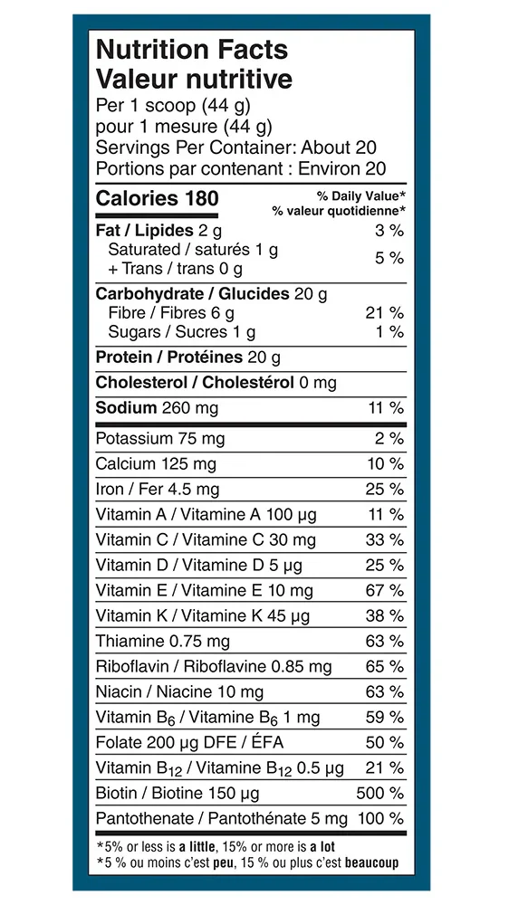 Protéines de pois, Amidon de pois, Gomme arabique, Poudre de brocoli biologique, Poudre de spiruline biologique, Extrait de feuille de stévia, Poudre de chou frisé biologique, Algue marine, Mélange d’extraits de fruits et de légumes (épinard, brocoli, carotte, betterave, tomate, pomme, canneberge, orange, bleuet, fraise, champignon shiitake, cerise), Cannelle moulue biologique, Gomme de guar, Mélange de fruits (extrait de pépin de raisin, poudre de mangoustan, poudre de maqui biologique, poudre de grenadebiologique, poudre de goji biologique, poudre d’açaï), Extrait de romarin, Probiotiques (Bacillus subtilis DE111MD), Arômes naturels.
